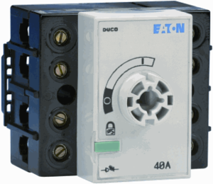 Eaton Industries Duco lastscheider, 4 polen, nom. continustroom Iu 40A, max. nom. bedrijfsspanning Ue bij A 415V, nom. continustroom, AC-21, 400 V 40A, 1 schakelaars, nom. vermogen, AC-23, 400 V 20kW, nom. continustroom, AC-23, 400 V 40A, toegelaten korte-duur stroom Icw 1kA,