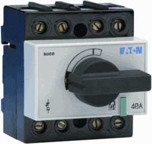 Eaton Industries Duco lastscheider, 4 polen, nom. continustroom Iu 40A, max. nom. bedrijfsspanning Ue bij A 415V, nom. continustroom, AC-21, 400 V 40A, 1 schakelaars, nom. vermogen, AC-23, 400 V 20kW, nom. continustroom, AC-23, 400 V 40A, toegelaten korte-duur stroom Icw 1kA,