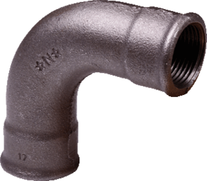 Nefit Industrial Zwart 2 fitting met 2 aansluitingen, bocht, nom. diameter aansluiting 1 1/2" (15), nom. diameter aansluiting 2 1/2" (15), aansluiting 2 binnendraad cilindrisch B, oppervlaktebescherming aansluiting geen (onbehandeld), bochthoek 90°,