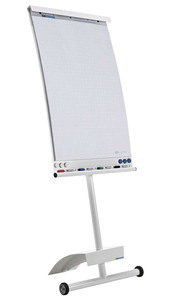 Moderne uitgevoerde design flip-over uit wit gelakte buizen met gebogen platen, flexibel instelbare ophangpunten voor elk type flip-overpapier, traploos in hoogte instelbaar door gasveer en stijlvolle afleggoot. Let op: niet beschrijfbaar op de achterzijde.