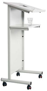 Verrijdbare stalen lessenaar met een stevig frontpaneel en een extra legplank. Instelbare hoogte. Gesloten lessenaar model: gesloten voorkant. Aflopend bovenblad. Houten legborden. Gemonteerd op 4 wieltjes met rem.