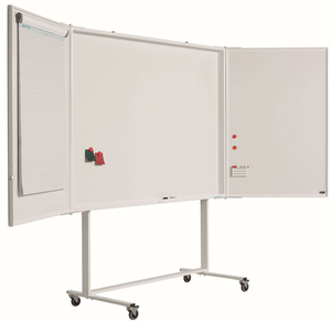Afsluitbare presentatiekast met twee dubbelzijdig beschrijfbare deuren met een wit emailstalen oppervlak, inclusief Design flip-overklem (geboord) en flip-overpapier (50 vellen) Low Gloss emailstalen projectieoppervlak (middenvlak) met een wit aluminium profiel Wit aluminium frame met witte hoekstukken Geschikt voor muurmontage of plaatsing over verrijbaar onderstel Geschikt voor zeer intensief en duurzaam gebruik; levenslange garantie op schrijven en wissen