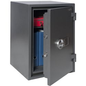 Salvus kluis Palermo 3 Elo. Capaciteit: 53 l. Brandvertragend: Ja. Brandvertragend voor papier: 30 Min. Slottype: Elektronisch slot. Metalen Twist-Lock Klem: Aantal planken: 1. Afsluitbaar: Ja. Afmetingen: 670 x 440 x 450 mm (h x b x d). Kleur: Grafietgrijs.
