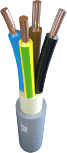 Tkf NL-Sterkstroomkabels YMz1K Cca 0,6/1 kV voedingskabel v/a 1 kv vaste aanleg, samenstelling geleider klasse 1 = massief, 4 aders, nom. geleiderdoorsnede 2.5mm², nom. geleiderdiameter 1.74mm, geel/Groene ader, ader-isolatie groen/Geel - Blauw - Brui, mantelkleur grijs,