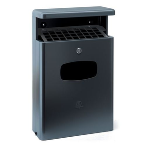 Aluminium afvalbak en asbak met aluminium binnenbak. Voor wandbevestiging. Afmeting binnenbak 36x18 cm, hoogte 26 cm.