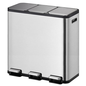 Rechthoekige pedaalemmer van geborsteld RVS met anti-vingerafdruk coating en voorzien van kunststof deksels met geruisloze sluiting. De drie pedalen bieden aparte toegang tot de kunststof bakken (3x15L) voor het selectief sorteren van afval. De openhoudfunctie vergrendelt het deksel in de open positie, voor eenvoudig schoonmaken en vervangen van de zak.