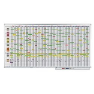 Legamaster professionele jaarplanner 75 items. Afmetingen: 100 x 200 cm. Geƫmailleerd schrijfoppervlak met een aluminium omlijsting. Indeling in 7-daagse weken en 365 dagen. Raster circa (H x B): 12 x 5 mm. Geschikt voor 75 personen. Grijs getinte weekendmarkering. Levering inclusief: datumstrokenset. Magneethoudend, beschrijfbaar met drooguitwisbare markers, ophangbevestiging, afleggoot en een whiteboard marker.