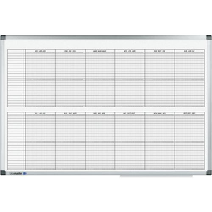 Jaarplanner in formaat van 2 x 6 maanden. Voor maximaal 20 personen / items / evenementen. Omlijsting van geanodiseerd aluminium. Magneethoudend, beschrijfbaar met drooguitwisbare markers. Afleggoot van 30 cm. Dagraster ca. H 11 x B 4 mm. Inclusief afleggoot, accessoireset: - TZ 111 / set van 4 markers - 40 etikethouders (10 x 60 mm) met witte insteeketiketten en ophangbevestiging.