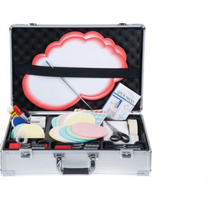 Voor een complete presentatie: inclusief uitschuifbare aanwijsstok, boardmarkers, schaar en een volledige set emoticons. Aluminium. Afsluitbaar, met twee sleutel. Kan makkelijk worden bijgevuld met workshopaccessoires van Legamaster. Comfortabel (ergonomisch) handvat. Het interieur beschermt de inhoud en houdt deze tijdens vervoer op zijn plaats. 1 folder Tips & Trucs 250 emoticons 500 rechthoekige kaart, 9,5 x 20 cm, diverse kleuren 100 ronde kaart, Ø 9,5 cm, diverse kleur 100 ronde kaart, Ø 14 cm, diverse kleur 100 ronde kaart, Ø 19 cm, diverse kleur 100 ovale kaart, 11 x 19 cm, diverse kleur 24 presentatiemarker TZ 41: 12 zwart, 12 rood 4 Jumbo presentatiemarker TZ 48: 1 zwart, 1 rood, 1 blauw, 1 groen 200 kopspeld, diverse kleur 1 lijmstick 10 wolk, 26,5 x 43 cm 1040 sticker, Ø 19 mm: 520 rood, 520 blauw 1 speldenkus met clip 1 tapedispenser incl. 1 rol tape 1 aanwijsstok, uitschuifbaar met geïntegreerd pen 2 boardmarker TZ 100: 1 zwart, 1 rood 1x 8-inch schaar 1 rol afplakband.