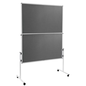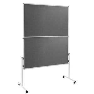 Functioneel, inklapbaar mobiel workshop. Dubbelzijdig vilten prikbord. Aluminium bordomlijsting met witte poedercoating. Voet en poten van staal met witte poedercoating. Set van 4 vergrendelbare zwenkwielen inbegrepen. Totale hoogte: 195 cm. Afmetingen bord: H 150 x B 120 cm.