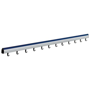 Een enkel garderobeprofiel, voorzien van jashaken. De bovenzijde van het profiel is afgewerkt in een blauwe epoxypoedercoating.
