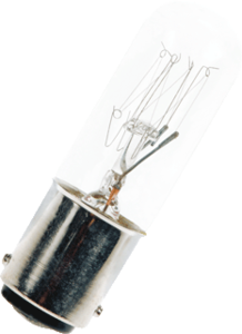 Bailey Miniature Bayonet Cap indicatie- en signaleringslamp, kleurloos, diameter 16mm, energie-efficiƫntieklasse volgens E G, voet BA15d, lampspanning 220 - 260V, totale lengte 54mm, technologie gloeilamp, lampvorm buis eenkneeps, nom. stroom 58mA, 10 - 15W, temperatuur 2700K,