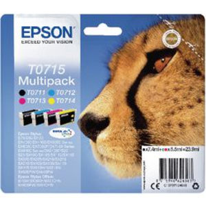 Epson inktcartridge Multipack T0715. Deze inktcartridge is geschikt voor de volgende Epson printers: Stylus D120, D78, D92, DX4000, DX4050, DX4400, DX4450, DX5000, DX6000, DX6050, DX7000F, DX7400, DX74. Inktvolume: 1 x 7,4 ml zwart. 1 x 5,5 ml geel. 1x 5,5 ml magenta. 1 x 5,5 ml cyaan. Printkleur: zwart, cyaan, magenta en geel. Hoeveelheid: pak 4 stuks.