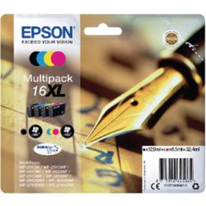 Epson inktcartridges 16XL. Deze inktcartridges zijn geschikt voor de volgende printers: Epson WF-2010W,2530WF, 2540WF, 2510WF, 2630WF, 2750DWF, 2760DWF, 2650DWF, 2660DWF, 2760DWF. Inhoud: 12,9 ml (zwart), 6,5 ml (kleuren). Printkleuren: zwart, cyaan, magenta, geel. Hoeveelheid: pak 4 stuks.