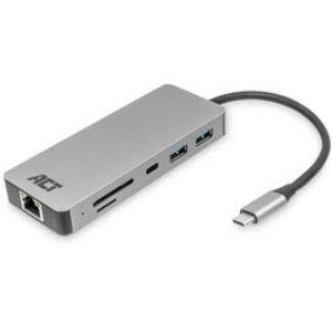 ACT Dockingstation. Basis productkleur: Zilver. Breedte: 125 mm. Diepte: 250 mm. Gewicht: 124 g. Hoogte: 160 mm. Inclusief: 1 x Dockingstation. Kabellengte: 18 cm. Kleur: Grijs. Merk: ACT. Poorten: 7. Power Type: USB. Product Type: Dockingstation. USB Connector: USB-C. Verbindingen: USB. Kantelhoek: -5° to +22 °.
