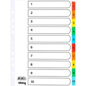 Viking tabbladen Mylar. Gemaakt van karton. Genummerd van 1 tot en met 10. Hebben een 11 gaten perforatie. Formaat: A4. Gewicht: 170 g. Kleur: geassorteerd.