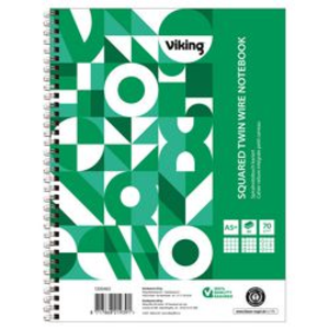 Viking Schrijfblok. Formaat: A5+. Liniatuur: Geruit. Binding: Dubbele draad. Bindwijze: Zijkant gebonden. Type omslag: Zachte kaft. Papiergewicht: 70 g/m². Materiaal: Metaal, papier. Aantal paginas: 160 Paginas. Kleur: Groen. Bij de levering inbegrepen: 1 x Draadgebonden schrijfblok.