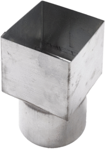 Rheinzink Classic vierkante fitting met 2 aansluit., zink, wanddikte 0.8mm, verloop, oppervlaktebescherming geen (onbehandeld), vierkantmaat 101.6mm, uitwendige buisdiameter aansluiting 96mm, aansluiting 1 mof, aansluiting 2 overig