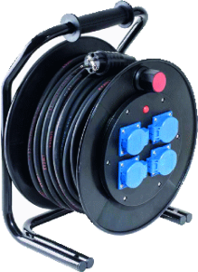 Keraf K310 verlengkabelhaspel, zwart, kabelvoorziening H07RN-F, beschermingsgraad (IP) IP44, behuizing kunststof, draagframe, met thermische beveiliging, 3 aders, aderdoorsnede 1.5mm², 4 contactdozen met randaard, kabellengte 33m, beveiliging buiszekering