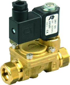 Isiflo SanPro magneetafsluiter recht, nom. diameter DN 15, aansluiting 1 knelring, aansluitspanning 24V, spanningstype DC, behuizing messing, afdichting EPDM, kwaliteitsklasse CuZn40Pb2 (CW617N), oppervlaktebescherming geen (onbehandeld), indirect werkend, aansluiting 2 knelring,