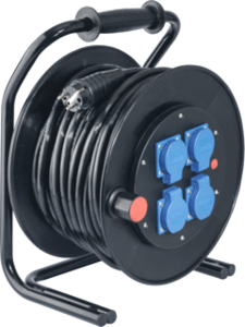 Keraf verlengkabelhaspel, zwart, kabelvoorziening H07BQ-F, beschermingsgraad (IP) IP44, behuizing kunststof, draagframe, met thermische beveiliging, 3 aders, aderdoorsnede 2.5mm², 4 contactdozen met randaard, kabellengte 25m, beveiliging buiszekering