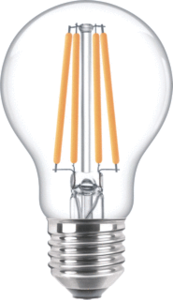 Philips CorePro led-lamp, wit, voet E27, 10.5W, temperatuur 4000K, energie-efficiƫntieklasse volgens E D, uitvoering glas/afdekking helder, weergave-index 80 - 89, lichtstroom 1521lm, lampvorm peer, lampaanduiding A-type, filament lamp, lichtkleur vlgs. EN 12464-1 neutraal wit 3300 - 5300,