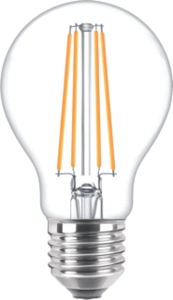 Philips CorePro led-lamp, wit, voet E27, 7W, temperatuur 2700K, energie-efficiƫntieklasse volgens E E, uitvoering glas/afdekking helder, weergave-index 80 - 89, lichtstroom 806lm, lampvorm peer, lampaanduiding A-type, filament lamp, lichtkleur vlgs. EN 12464-1 warmwit < 3300 K,