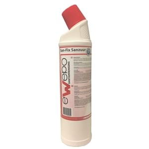 Ewepo San-Fix Sanzuur is een periodieke reiniger voor het gehele sanitair. San-fix Sanzuur verwijderd o.a. kalk, urinesteen en cementsluier. Het product is zowel puur, voor intensieve reiniging, als gedoseerd in water te gebruiken. Let op: Ewepo San-Fix Sanzuur is niet geschikt voor gebruik op kalkhoudende materialen zoals marmer, travetin etc.