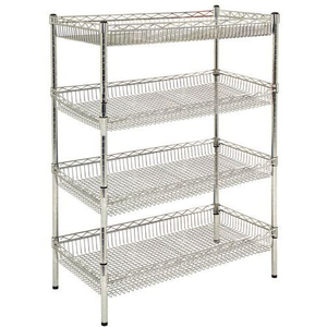 Stellingrek met manden Quick-Store+, Max. belasting per legbord: 150 kg, Hoogte: 1600 mm, Aantal legborden: 4, Type legbord: Rooster, Breedte: 915 mm, Diepte: 455 mm, Coating: Verchroomd, Type element: Zelfstandig, Model: Rek met manden Quick-Store+, Stelling voor: Diverse winkelproducten, Stelling lijn: Quick-Store+, Legbord materiaal: Staal, Montage: Zelfbouw, Frame materiaal: Staal, Breedte legbord: 910 mm, Diepte legbord: 455 mm, Afstand: 25 mm, Geen gereedschap nodig: ja