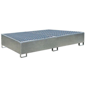 Opvangbak, Vermogen (aantal vaten): 8, Roostermat: ja, Inhoud opvangbak: 880 L, Kleur: Grijs, Totale lengte: 1240 mm, Totale breedte: 2480 mm, Totale hoogte: 395 mm, Max. statisch draagvermogen: 2500 kg, Max. dynamisch draagvermogen: 1500 kg, Gewicht: 260 kg, Materiaal: Staal, Recyclebaar product: Ja - 100%, Zuurbestendig: ja, Afwerking: Gegalv., Waterige oplossing: ja, Koolwaterstof oplosmiddelen: ja