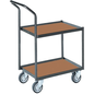 Bakkenwagen staal leeg, Lean Management: ja, Max. belasting: 200 kg, Totale hoogte: 995 mm, Totale breedte: 420 mm, Totale lengte: 750 mm, Aantal plateaus: 2, Model: Duwbeugel, Plateau materiaal: Hout, Wiel loopvlak: Rubber, Nuttige lengte plateau: 600 mm, Nuttige breedte plateau: 400 mm, Geschikt voor Euronorm bakken: 600 x 400 mm, Zwenkwiel Ø: 125 mm, Gewicht: 21.5 kg, Onderstel materiaal: Staal, Handgreep lengte: 0 mm, Legbord hoogte: 660 mm, Type wiel: 2 vast + 2 draaiend, Frame kleur: Zwart