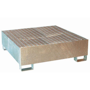 Opvangbak, Vermogen (aantal vaten): 4, Roostermat: ja, Inhoud opvangbak: 440 L, Kleur: Grijs, Totale lengte: 1240 mm, Totale breedte: 1240 mm, Totale hoogte: 395 mm, Max. statisch draagvermogen: 1500 kg, Max. dynamisch draagvermogen: 1000 kg, Gewicht: 135 kg, Materiaal: Staal, Recyclebaar product: Ja - 100%, Zuurbestendig: ja, Afwerking: Gegalv., Waterige oplossing: ja, Koolwaterstof oplosmiddelen: ja