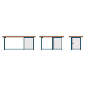 Gerecyclede werkbank Bijzonder stevige werkbank, geschikt voor gebruik op de werkplaats. Uitgerust met een stevig legbord in geverfd multiplex om met uw gereedschap te werken. Met vergrendelbare werkbankkast om uw materiaal in alle veiligheid op te bergen. Wordt geleverd zonder achterlijst. Deze werkbanken worden ongemonteerd geleverd.