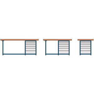 Gerecyclede werkbank Stevige werkbank geschikt voor gebruik op de werkplaats. Uitgerust met een stevig legbord in multiplex. Met 6 afsluitbare laden om uw materiaal op te bergen. Wordt geleverd zonder achterlijst. Deze werkbanken worden ongemonteerd geleverd.