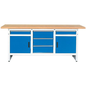 Werkbank Metec 200, Max. belasting: 300 kg, Totale hoogte: 840 mm, Totale breedte: 2000 mm, Werkbank blad materiaal: Beuk multiplex, Totale diepte: 700 mm, Frame kleur: Lichtgrijs, Dikte tafelblad: 40 mm, Aantal laden: 5, Aantal kasten: 2, Kleur deur: Blauw, Lade kleur: Blauw, RAL: 7035 5010, Max. belasting lade: 60 kg, Special Covid-19: nee, Gewicht: 141.0 kg
