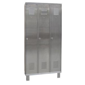 Garderobekast, Type garderobekast: Met vakken en garderobe, Materiaal: Roestvrij staal, Aantal kastkolommen: 3, Onderstel: Op poten, Type sluiting: Met hangslot, Hoogte: 1940 mm, Breedte: 1200 mm, Breedte kolom: 400 mm, Diepte: 490 mm, Plaatstaal dikte: 8/10de, Kleur ombouw: Grijs, Kleur deur: Grijs, Geleverd gemonteerd: ja, Garderobekast gebruiksomgeving: Zware industrie, Aantal vakken/kolom: 1, Recyclebare verpakking: Ja - 100%, Recyclebaar product: Ja - 100%, Gewicht: 89.2 kg, Aantal vakken: 3