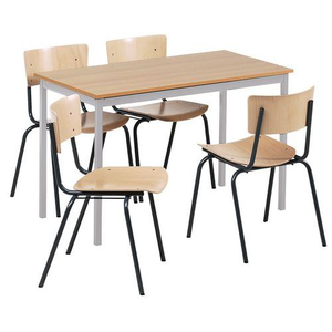 Al het nodige voor uw bedrijfsrestaurant Compleet meubilair bestaande uit 4 stoelen met een beuken zitting en zwarte poten en een tafel met beuken blad en lichtgrijze poten. Deze set met tafel en stoelen is eenvoudig te onderhouden, ideaal voor kantines.