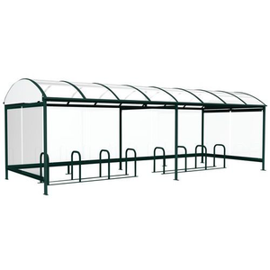 Fietsoverkapping Combrailles Abri Plus, Totale lengte: 8.12 m, Totale diepte: 2.43 m, Model: Combrailles, Totale hoogte: 2.10 m, Kleur: Groen, Frame materiaal: Metaal, Recyclebare verpakking: Ja - 100%, Recyclebaar product: Ja - 100%, Dak materiaal: Cellulair polycarbonaat, Type: Fietsenstalling