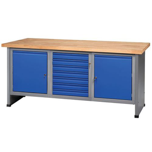 Robuuste en extra brede werkbank met massief beuken blad. Laden met rollagers, dus eenvoudig te openen en sluiten. Deur met slot voor het veilig opbergen van uw spullen. Lade 100% uittrekbaar en centrale sluiting. De werkbanken worden ongemonteerd geleverd.