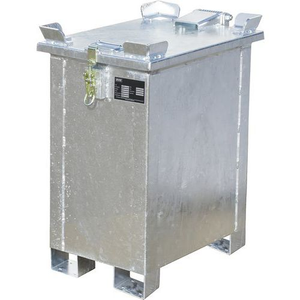 Voor een veilige opslag van defecte of beschadigde lithium-ion-accu's Robuuste opslagcontainer voor lithium-ion-accu's van plaatstaal. Vergrendelbare deksel met mechanische compensatie via een veer bij de handgrepen. Optimale bescherming tegen brand dankzij het koelende effect van het vulmateriaal. Vrije hoogte van 100 mm voor heftrucks en stapelaars.