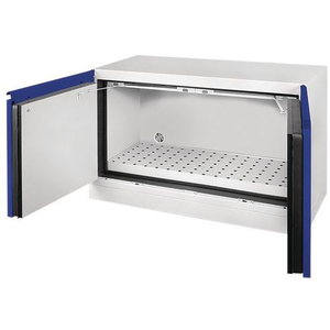 Lage veiligheidskast voor de opslag van lithium-ionbatterijen, Materiaal: Staal, Totale hoogte: 720 mm, Totale breedte: 1090 mm, Voor producten: (Lithium)batterijen, Brandveilig: 90 min, Totale diepte: 520 mm, Aantal vakken: 1, Aantal deuren: 2, Aantal legborden: 1, Kleur ombouw: Blauw, Kleur deur: Blauw, Nuttige hoogte: 593 mm, Nuttige breedte: 978 m, Totale hoogte (Reeks): Laag of onder laboratoriumtafel (600 - 800 mm), Totale breedte (Reeks): 800 mm, Gewicht: 139 g, Nuttige diepte: 349 cm, Deur openingstype: Klapdeur, Type sluiting: Met sleutel, RAL: 5010, CE: ja