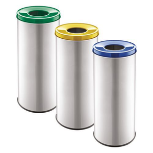 Set van 3 metalen afvalbakken voor afvalscheiding van plaatstaal. De containers hebben een kunststof basis die de vloer beschermt tegen schade. Ergonomische vorm.