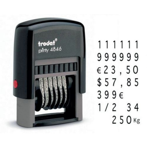 Nummerstempel Printy 4846 met 6 stroken. €-symbool op de eerste band. Automatische inkttoevoer. Afdruk 4 x 27 mm - Tekenhoogte: 4 mm. Zwarte inktcassette.