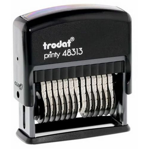 Nummerstempel Printy 48313 met 13 stroken. Afmetingen (LxH): 20 x 3,8 mm. Automatische inkttoevoer. Afdruk 4 x 27 mm - Tekenhoogte: 4 mm. Zwarte inktcassette.