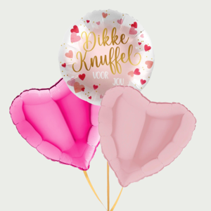 Laat iemand weten dat je aan ze denkt met deze liefdevolle ballontros! De ronde ballon met de tekst “Dikke knuffel voor jou” vormt samen met twee hartvormige ballonnen in zachtroze en donkerroze een hartverwarmend geheel. Een mooi gebaar voor een verjaardag, jubileum of als oppepper op een moeilijk moment. De kleurrijke ballonnen vliegen bij het openen van de doos meteen omhoog.