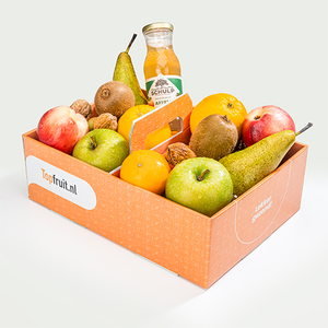 Deze fruitbox standaard is rijkelijk gevuld met heerlijk vers fruit en een sapje van Nederlandse bodem. In de box zit een mooi inlay mandje zodat de ontvanger deze op tafel kan plaatsen en een leuk aandenken heeft aan de gezonde attentie.